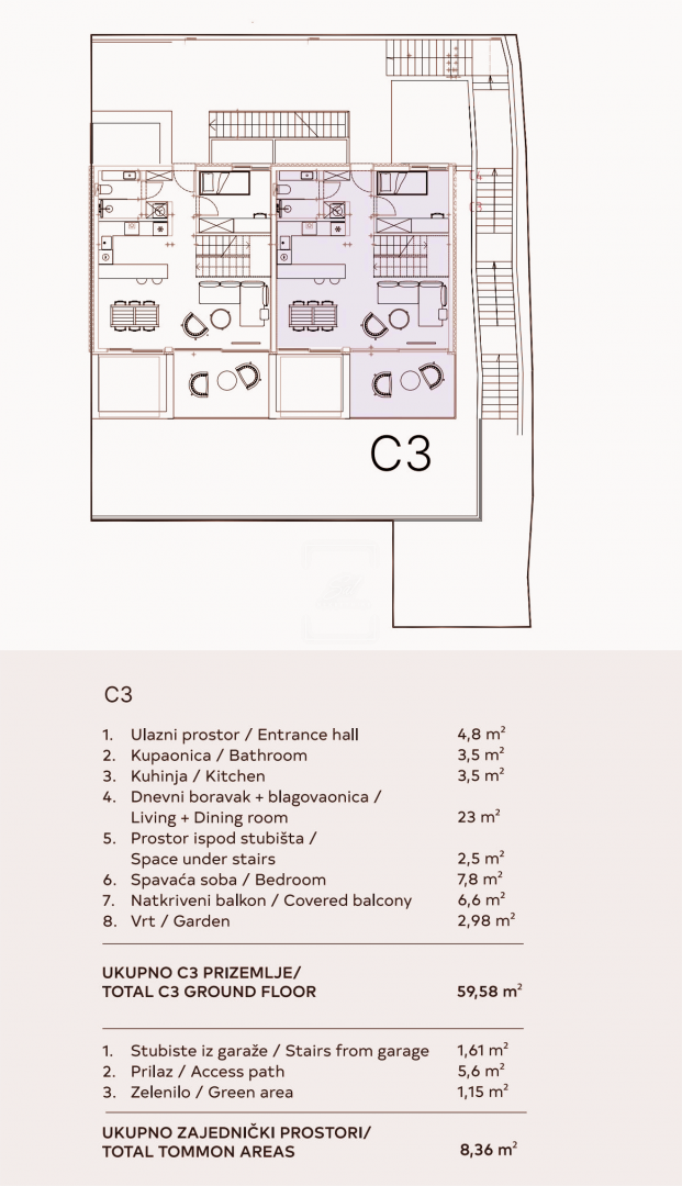 Sastoji se od ulaznog prostora, kupaonice, spavaće sobe, kuhinje s blagovanjem, dnevnog boravka, prostora ispod stubišta, natkrivenog balkona i vrta. Prostor je odlično povezan s vanjskim dijelom, što pruža osjećaj prostranosti i privatnosti.