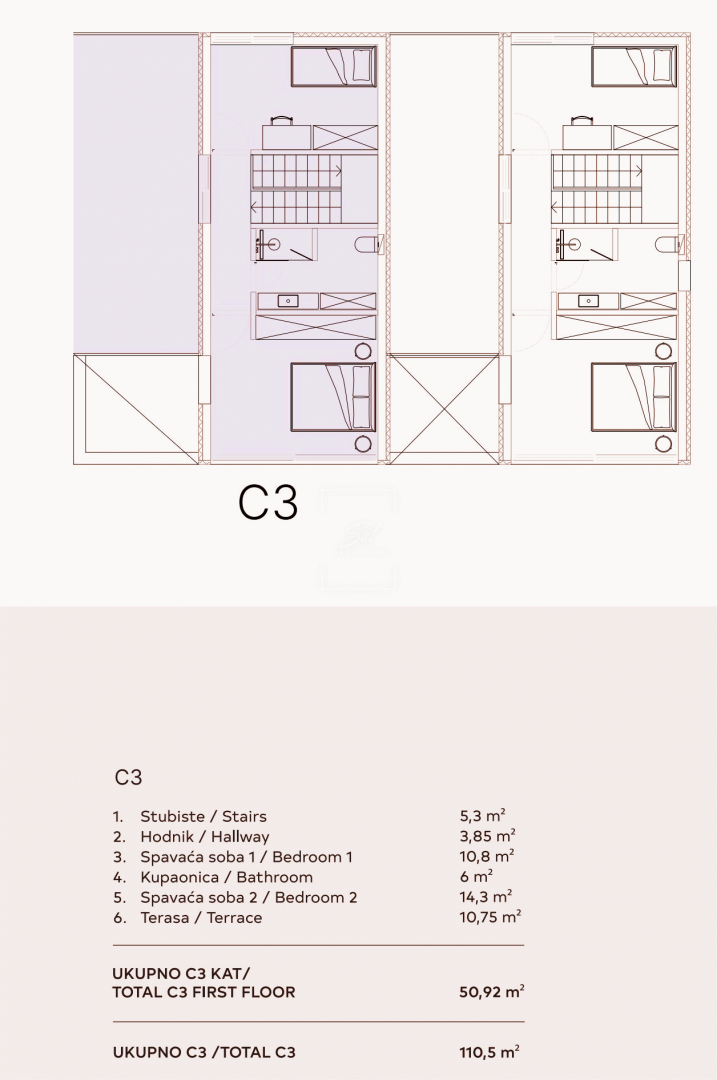 Obuhvaća hodnik, dvije spavaće sobe, kupaonicu te veliku terasu s predivnim pogledom.