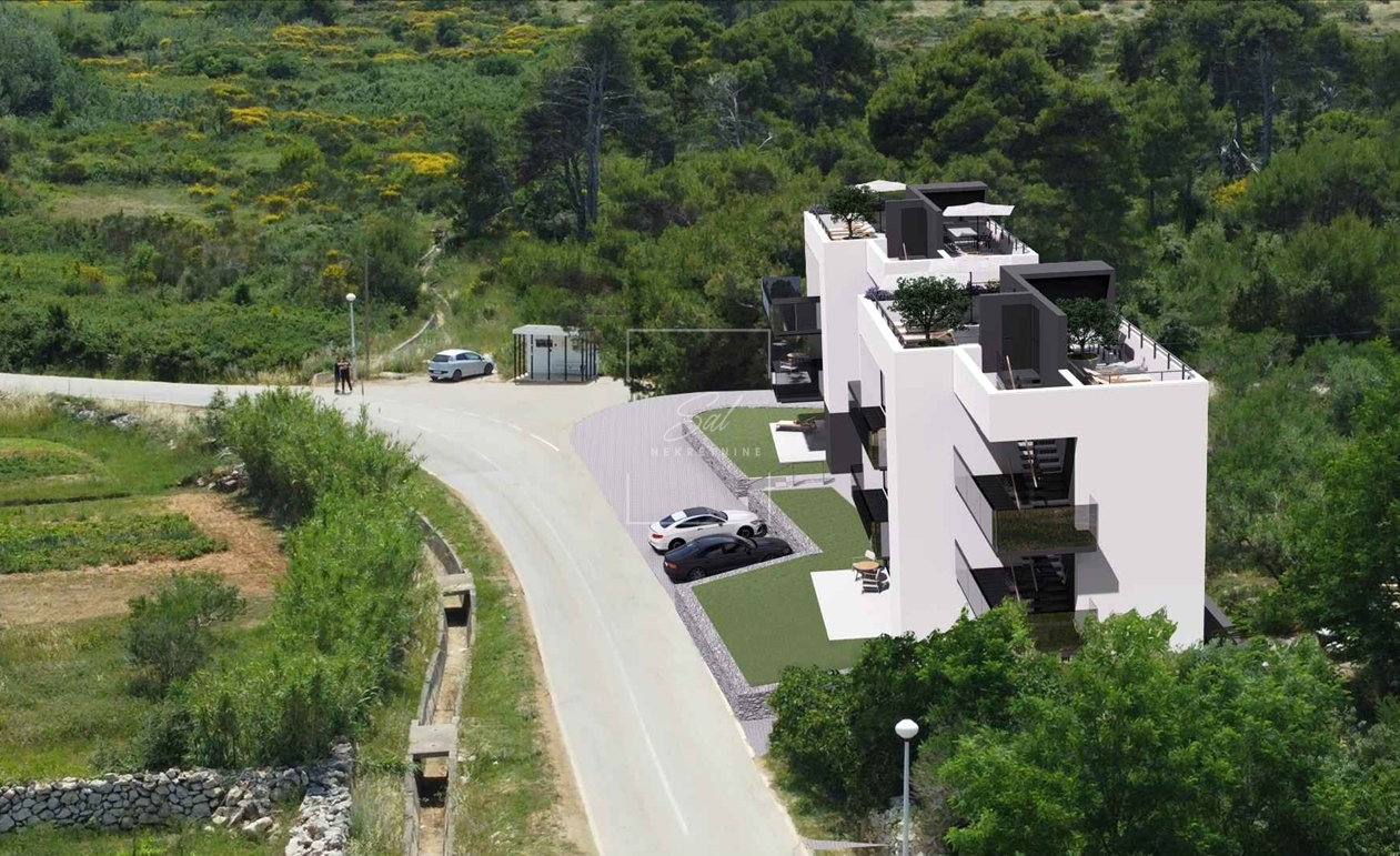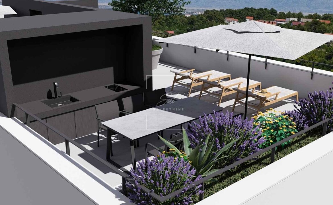 Stanu pripada jedno parkirno mjesto s mogućnošću kupnje dodatnog, natkriveni balkon, kao i krovna terasa od 27,4 m² s predviđenom ljetnom kuhinjom i ljetnim tušem – idealno mjesto za uživanje u suncu, obiteljskim druženjima i ljetnim večerima.